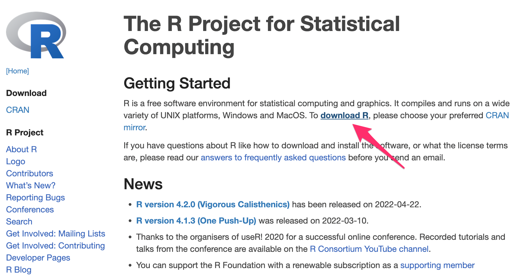 Для установки R необходимо зайти на соответствующую веб-страницу https://www.r-project.org/ и выбрать download R как показано на рисунке ниже.